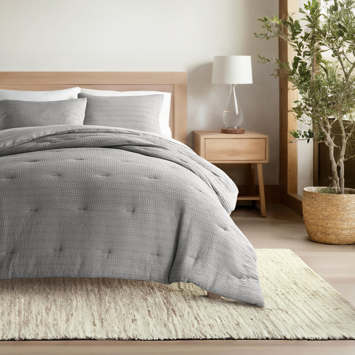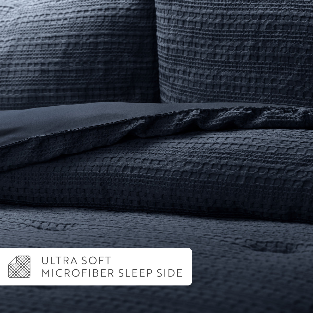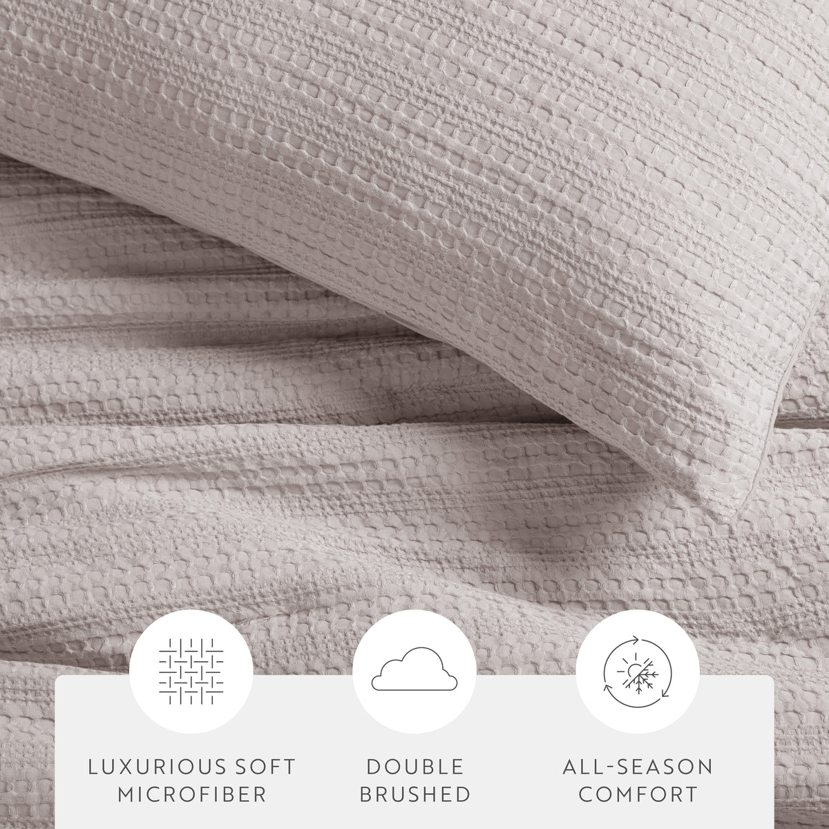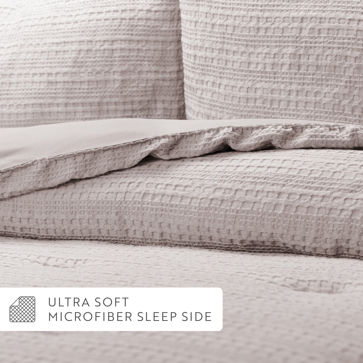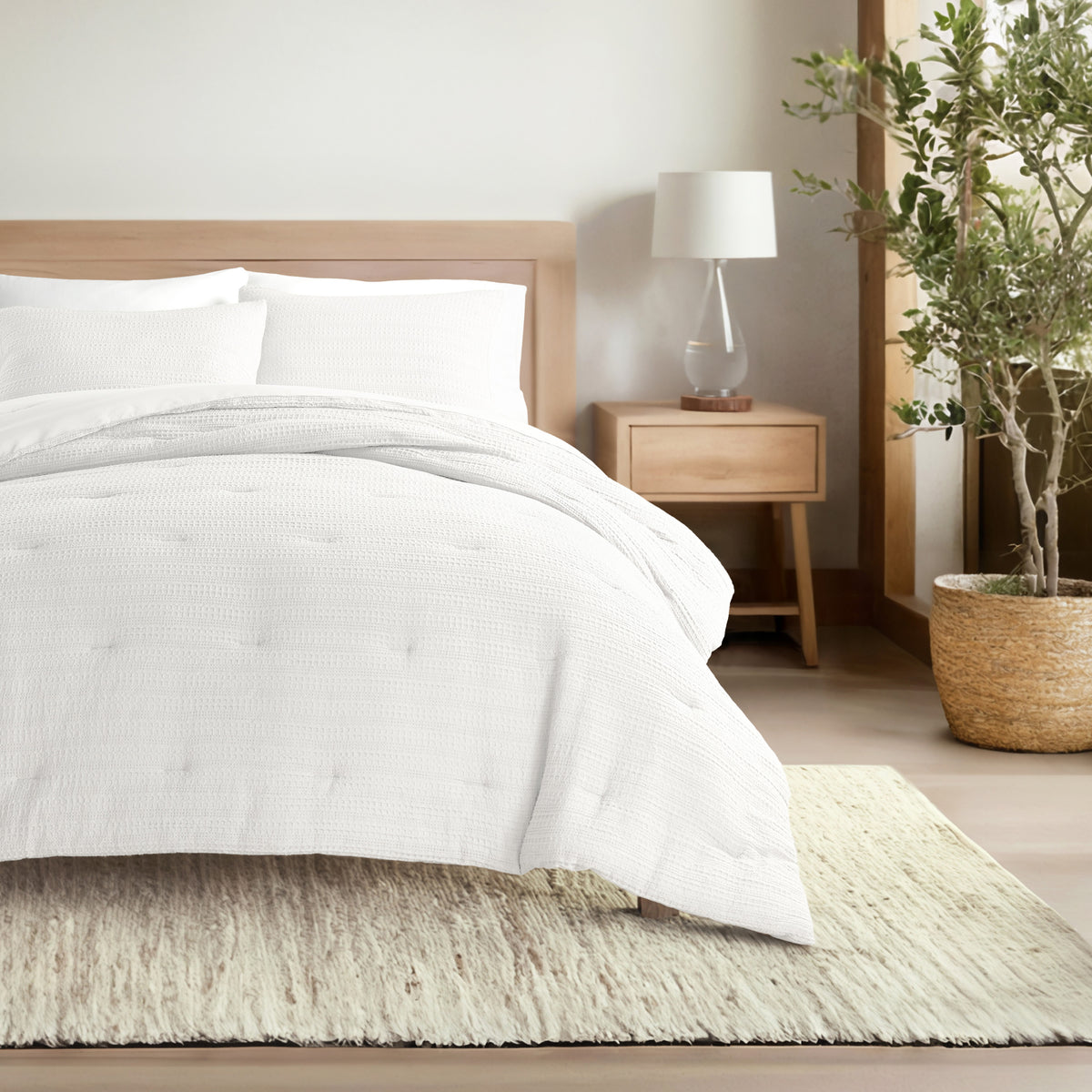 Indulge in the epitome of comfort with our exquisite 3-piece Waffle Textured Comforter set. Its polyester fill ensures a dreamy sleep experience, while the Soft Pre-Wash Finish and Double-Brushed fabric provide a luxurious touch. Plus, its oversized dimensions are perfect for extra deep mattresses. Elevate your sleep sanctuary today and embrace the ultimate in cozy sophistication.