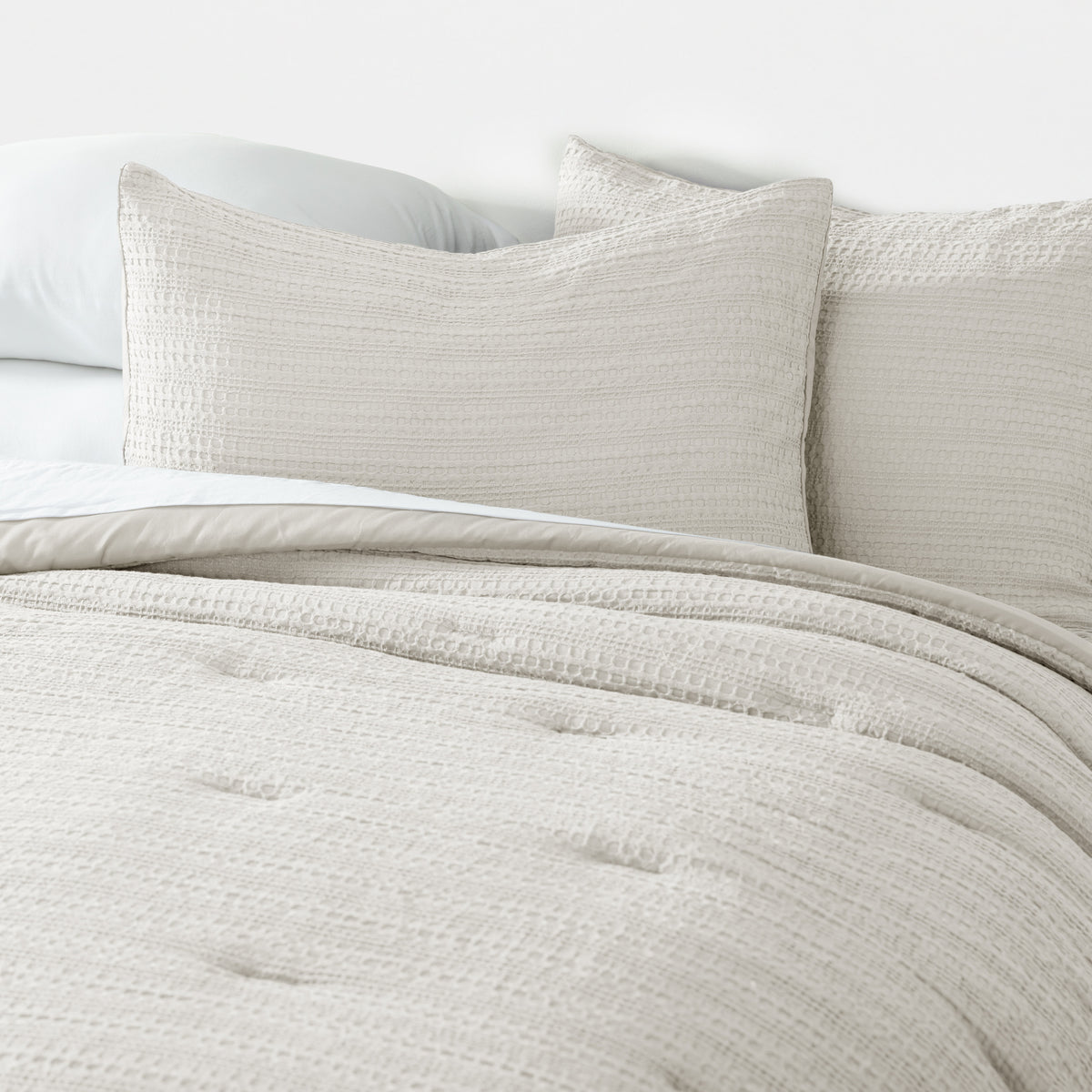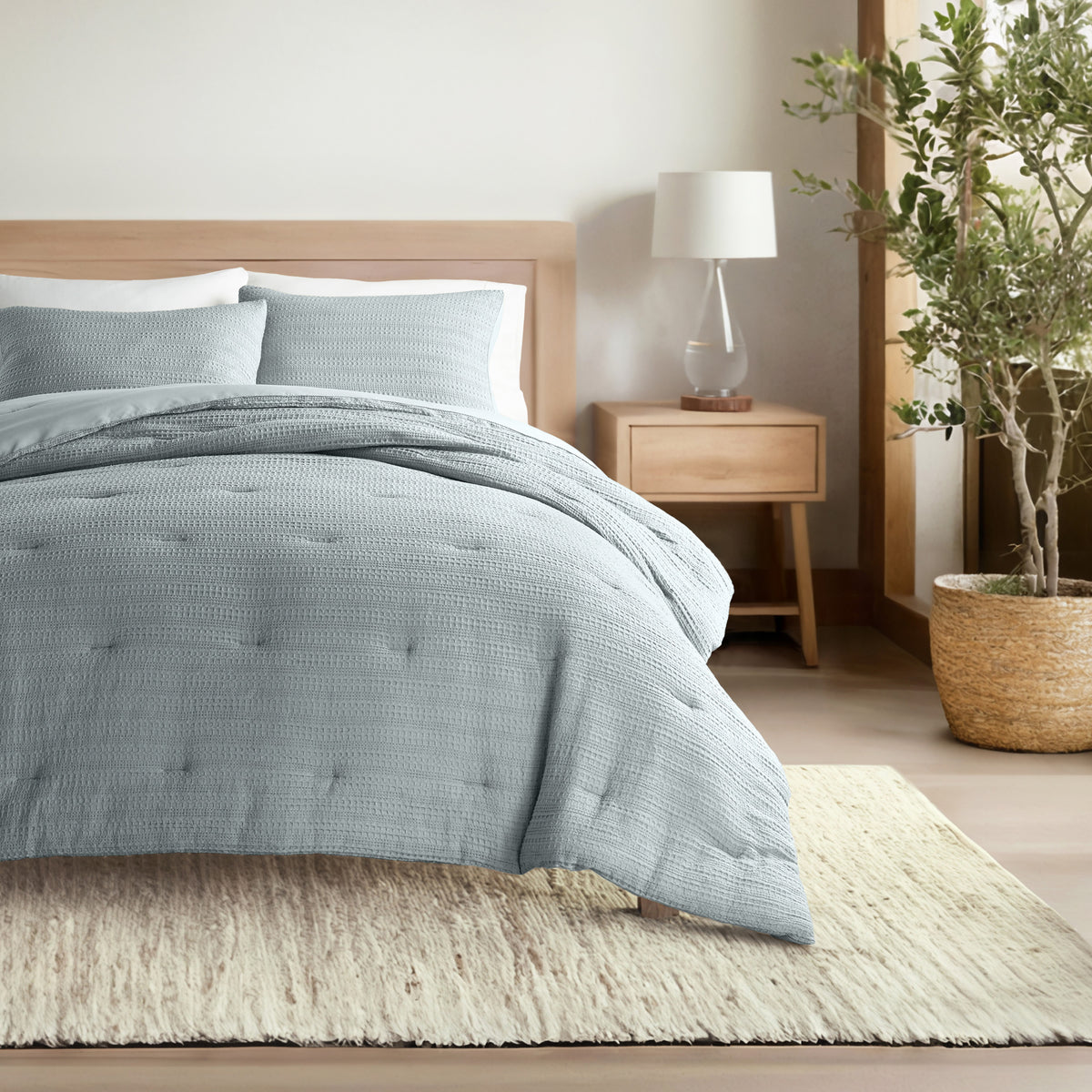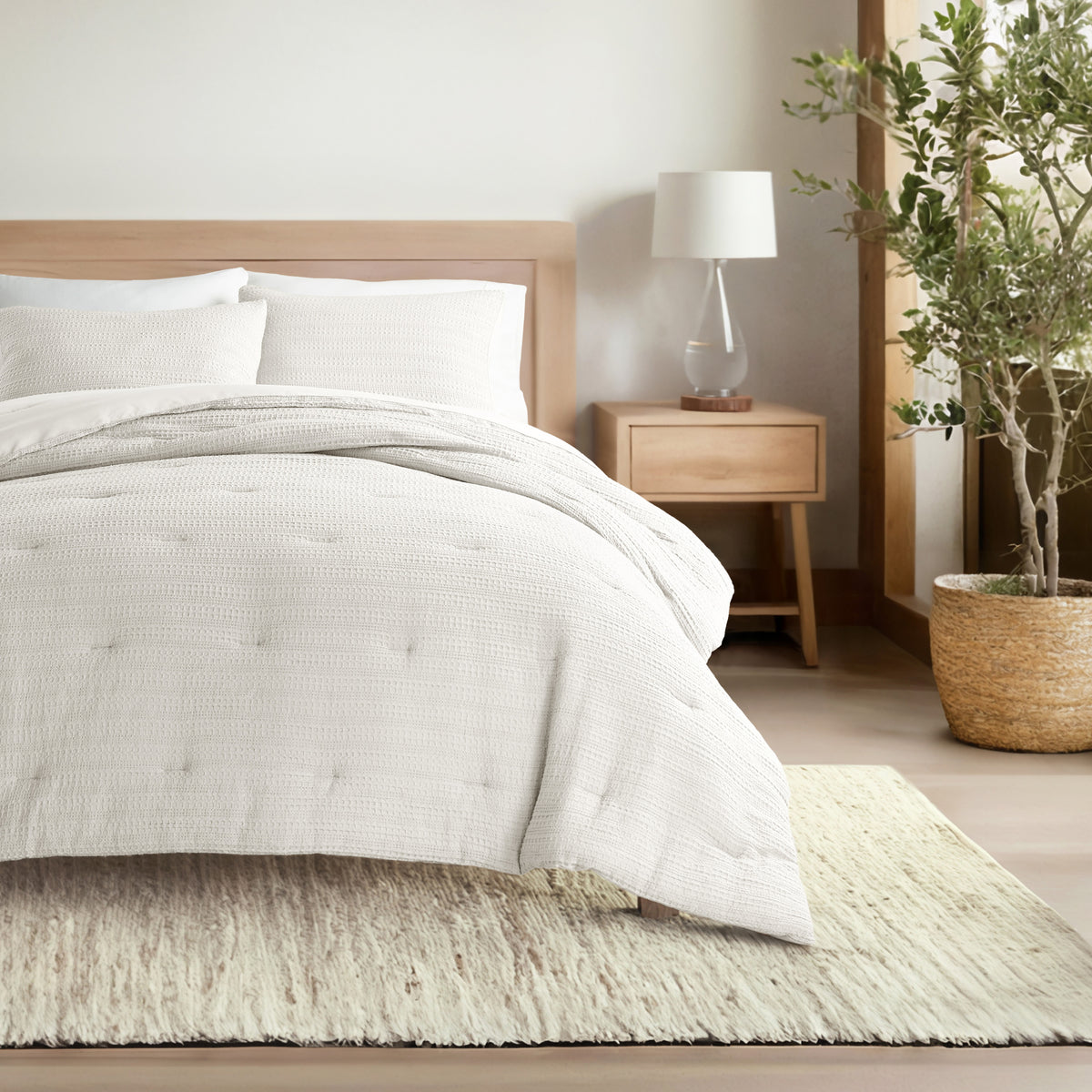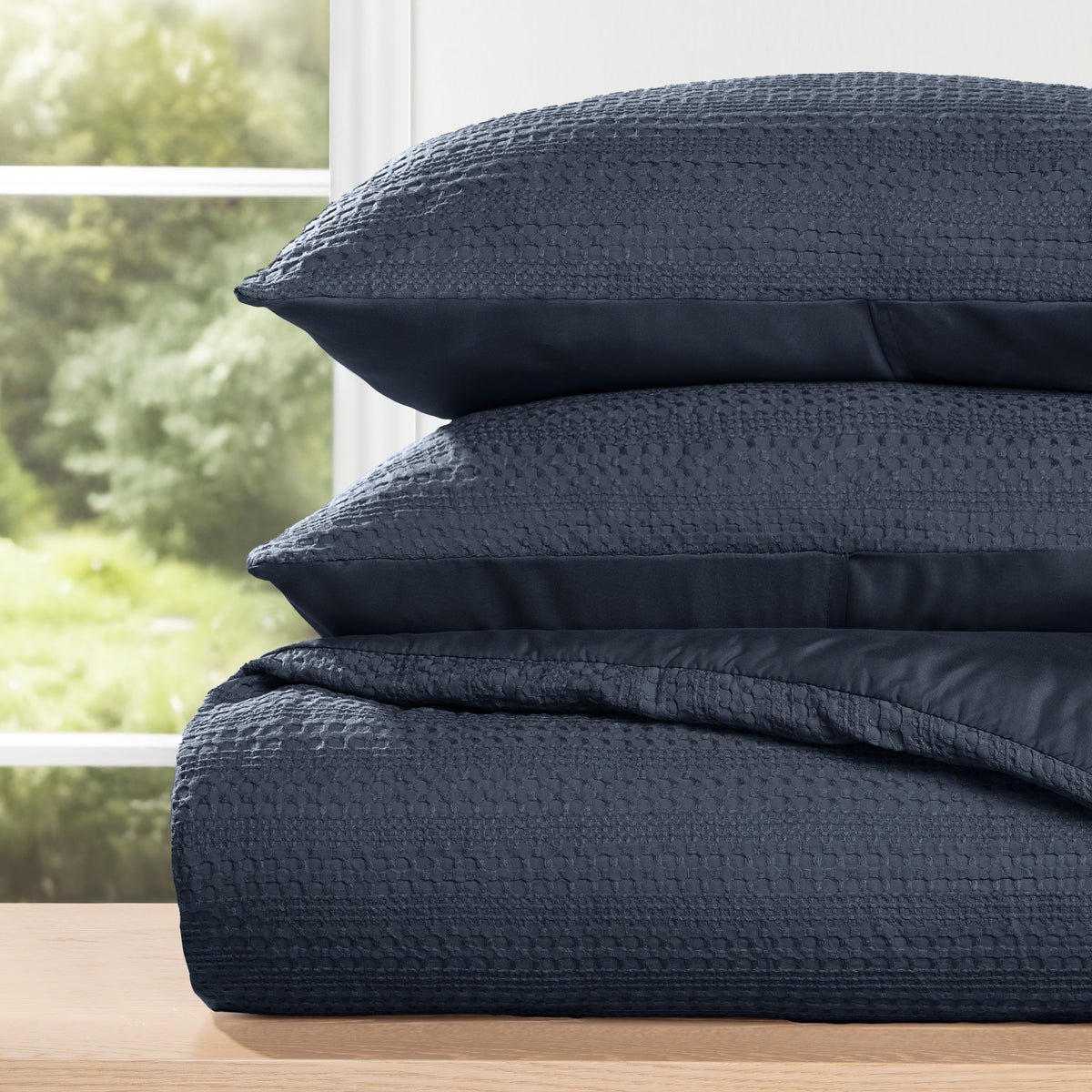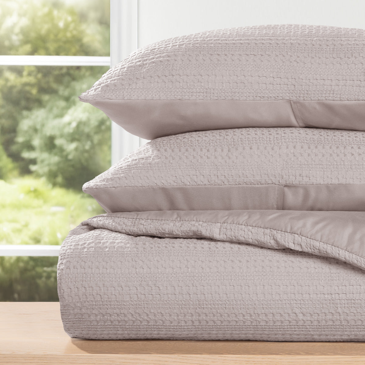 Indulge in the epitome of comfort with our exquisite 3-piece Waffle Textured Comforter set. Its polyester fill ensures a dreamy sleep experience, while the Soft Pre-Wash Finish and Double-Brushed fabric provide a luxurious touch. Plus, its oversized dimensions are perfect for extra deep mattresses. Elevate your sleep sanctuary today and embrace the ultimate in cozy sophistication.