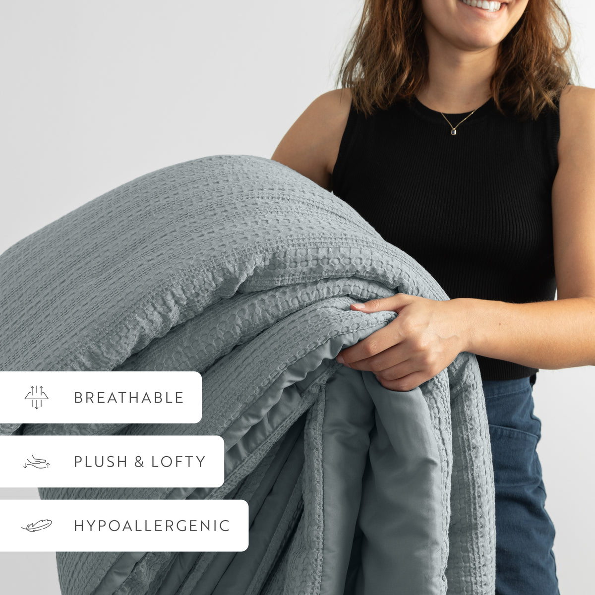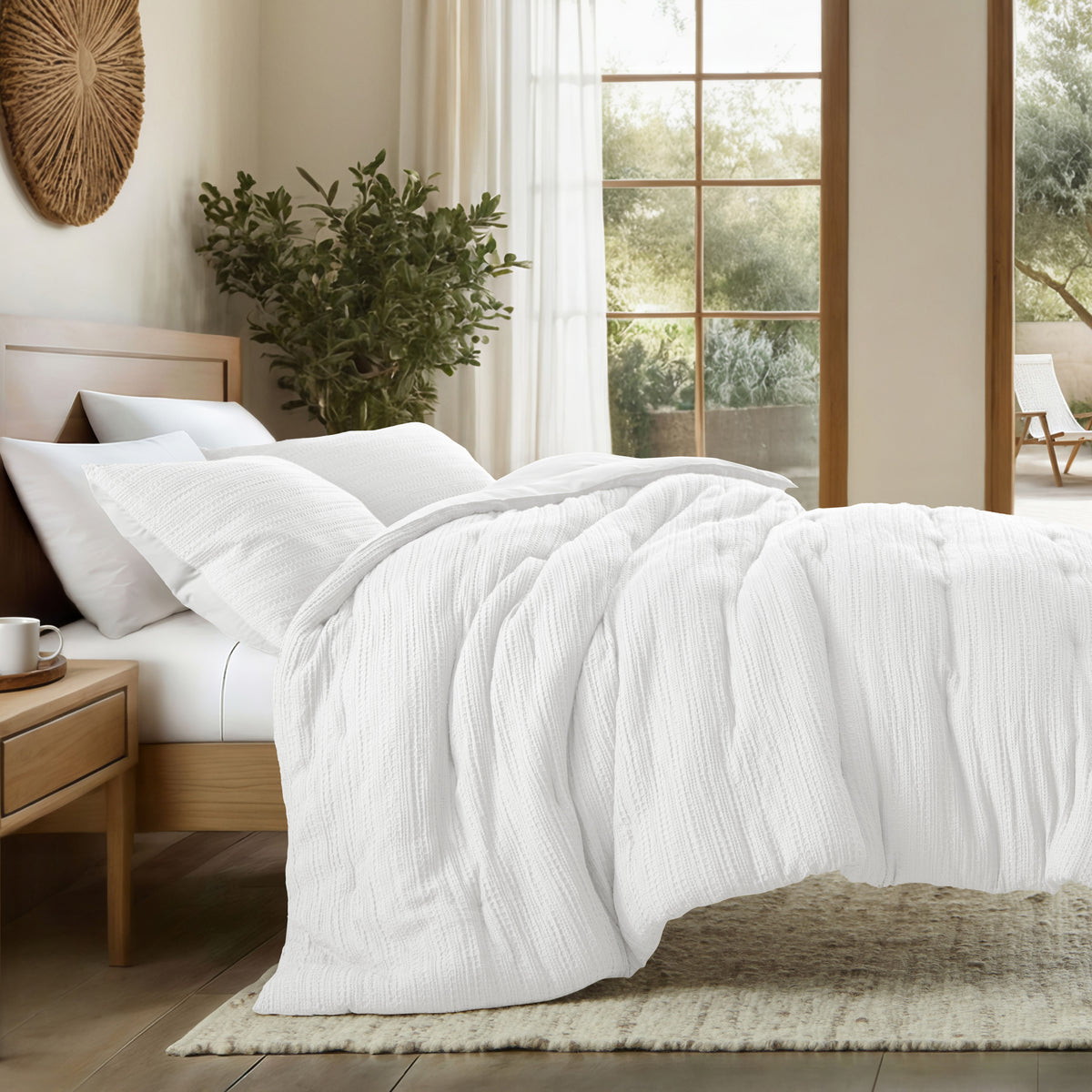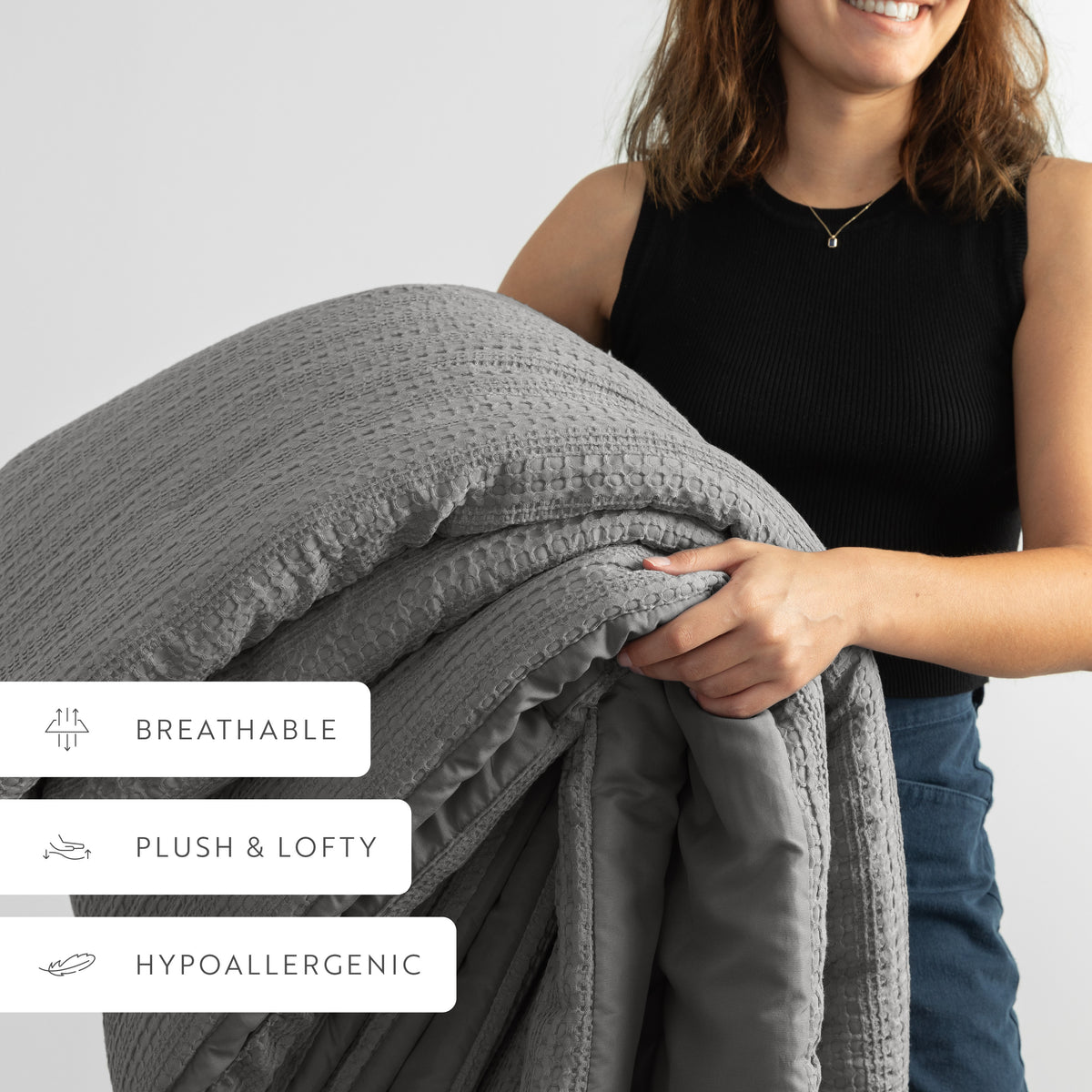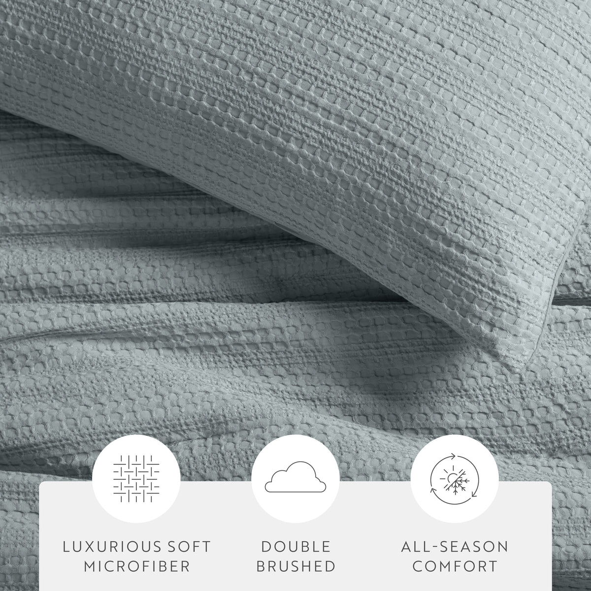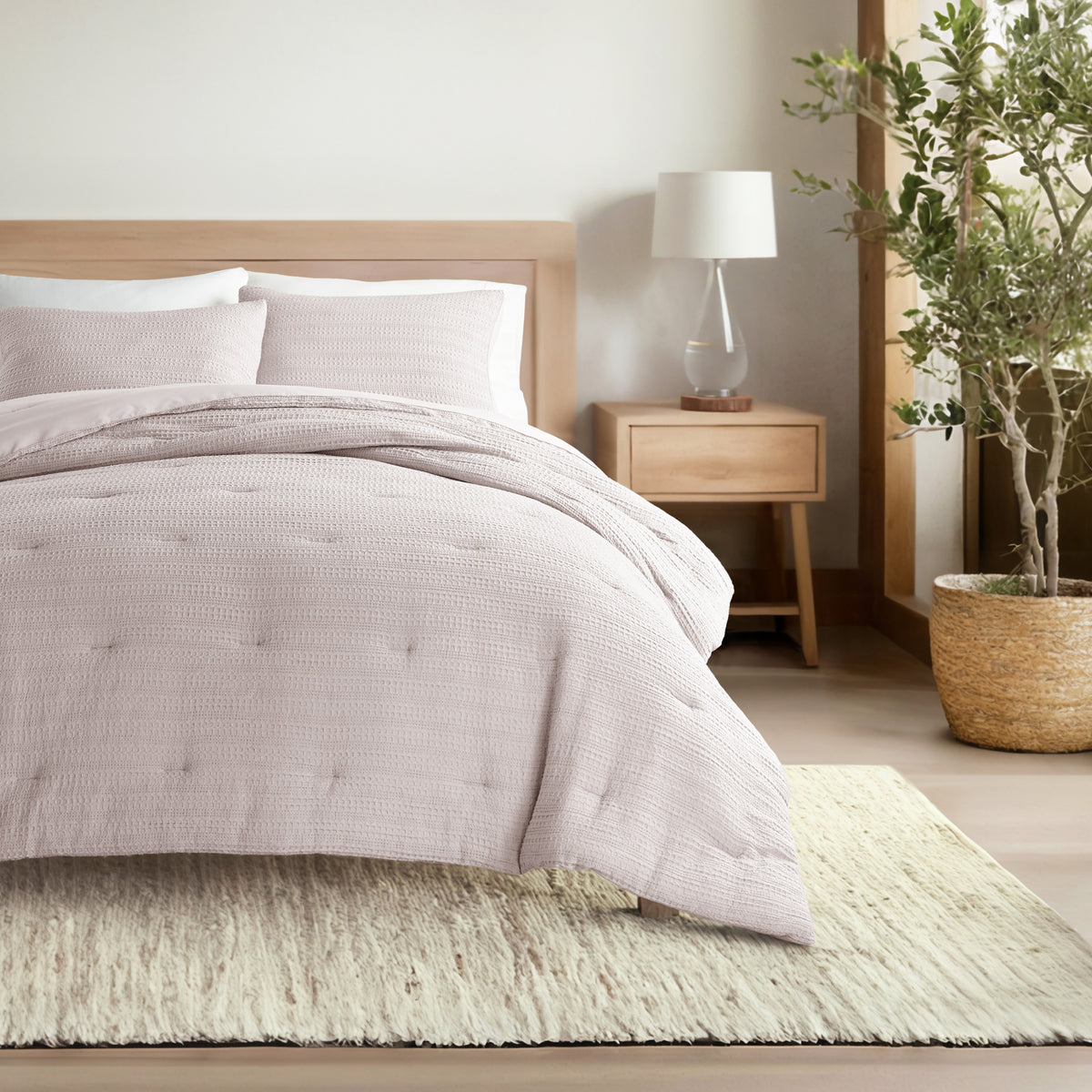 Indulge in the epitome of comfort with our exquisite 3-piece Waffle Textured Comforter set. Its polyester fill ensures a dreamy sleep experience, while the Soft Pre-Wash Finish and Double-Brushed fabric provide a luxurious touch. Plus, its oversized dimensions are perfect for extra deep mattresses. Elevate your sleep sanctuary today and embrace the ultimate in cozy sophistication.
